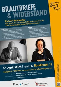 teatro caprile lädt zu einer szenischen Lesung der Liebe und Gedanken des 1945 hingerichteten evangelischen Theologen Dietrich Bonhoeffer – und bringt die Beziehung von Maria Wedemeyer und Dietrich Bonhoeffer auf die Bühne. Sie zeigt eine selbstbewußte sehr junge Frau und einen bereits berühmten Pfarrer, der im Widerstand gegen die Nazis aktiv ist. Nach wenigen kurzen Treffen, in denen Maria sich für Bonhoeffer entscheidet und die Initiative zur Verlobung ergreift, wird er inhaftiert und im April 1945 erhängt. Maria erfährt erst im Juni von seinem Tod. Es lesen Katharina Grabher und Andreas Kosek.
