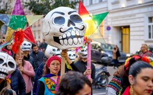 Der Tag der Toten – Día de Muertos – ist nicht nur ein mexikanischer Festtag, an dem getrunken und gegessen, gefeiert und getanzt wird. In vielen Regionen Mexikos ziehen große Paraden mit Maskentänzer*innen durch die Straßen. Wir wollen diesen Tag im Weltmuseum Wien feiern, Sie lernen die Bräuche des Día de Muertos kennen und sind eingeladen, mitzufeiern und mitzutanzen.
